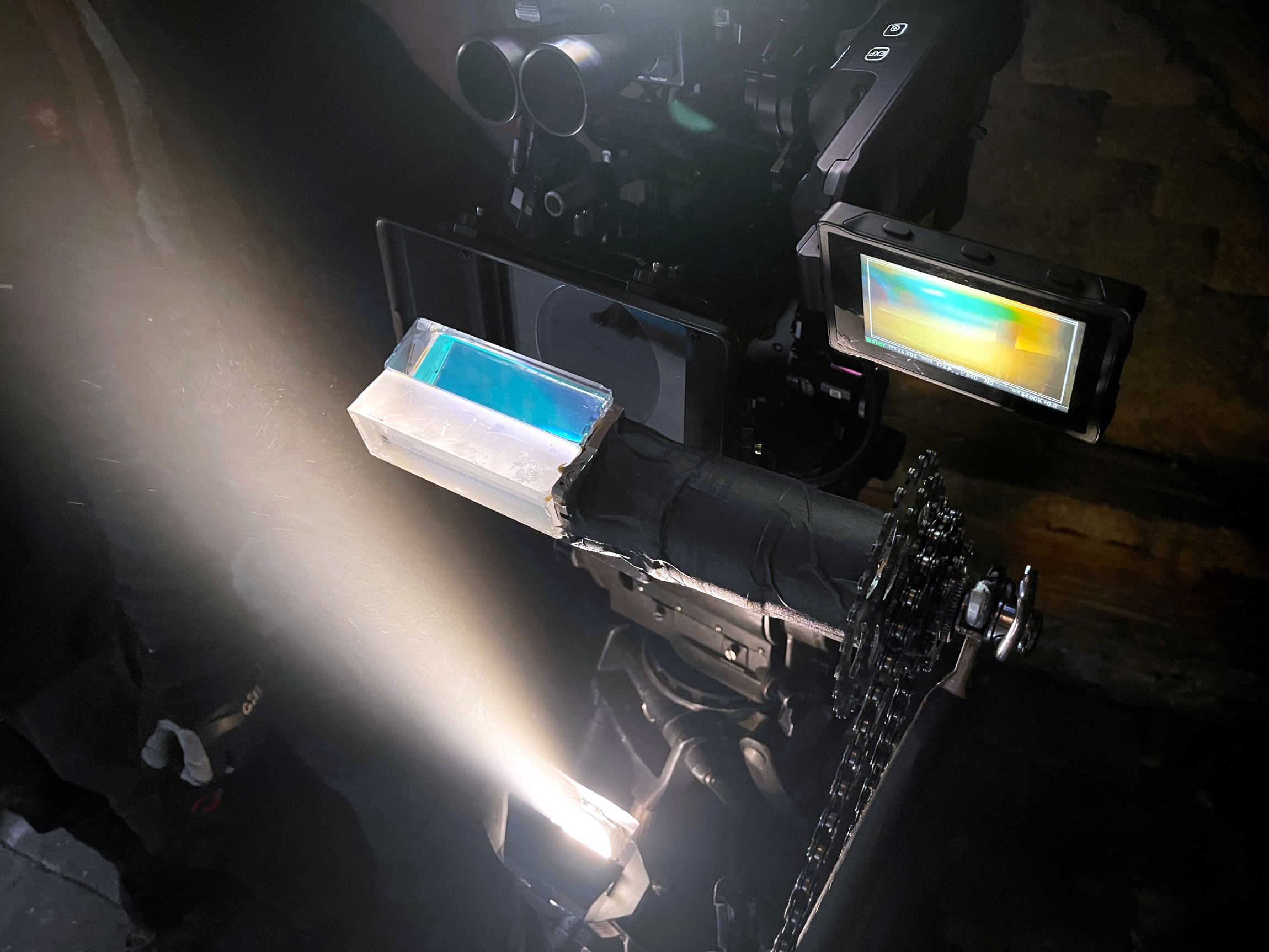 Für die Übergänge in die traumhaften Szenen hat Grunsky – wie im Bild oben zu sehen – ein Prisma auf ein umgebautes Fahrrad montiert. "Mit den Pedalen dreht man das Prisma vor der Kamera. Das gibt einen magischen Effekt, der gut passt." Ein anderer Effekt wurde über die Geschwindigkeit der Bilder erzielt. "Normalerweise nimmt eine Kamera 24 Bilder pro Sekunde auf – und so wird ein Film auch abgespielt." Für einige Traumszenen hat Grunsky aber nur sechs Bilder pro Sekunde aufgenommen, um die veränderte Wahrnehmung auszudrücken. "Beim Abspielen entsteht dann ein abgehackter Eindruck. Die Bewegungen verwischen."
